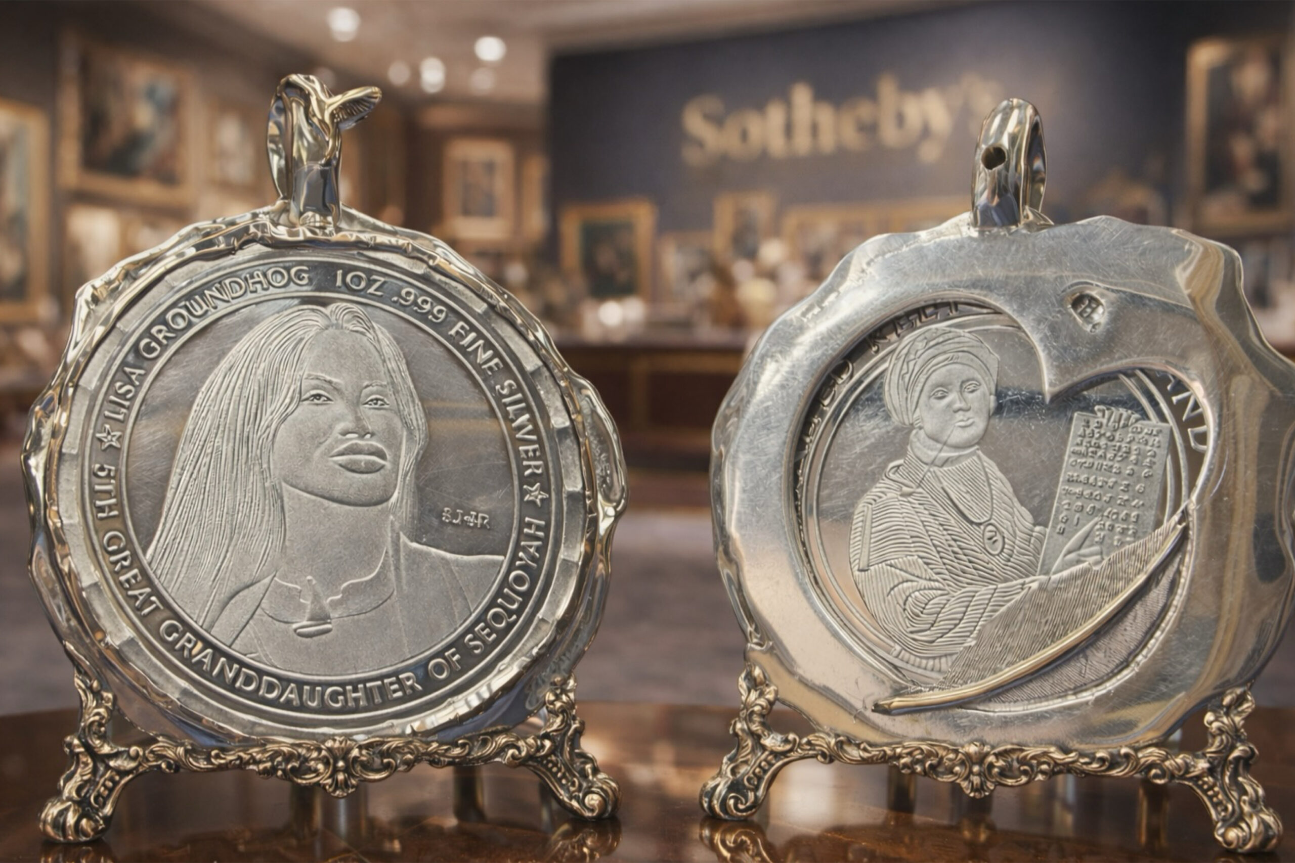 She sits in her Lawton, Oklahoma atelier surrounded by the quiet sheen of silver and gold. The light falls softly across her workbench. Tools rest within reach. A single commemorative silver dollar lies centered before her, one of sixty one known strikes honoring Sequoyah, the Cherokee statesman who created the syllabary that gave his nation written language.